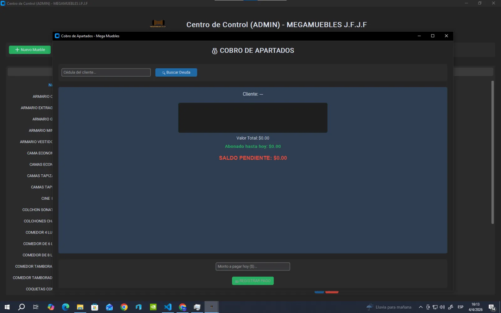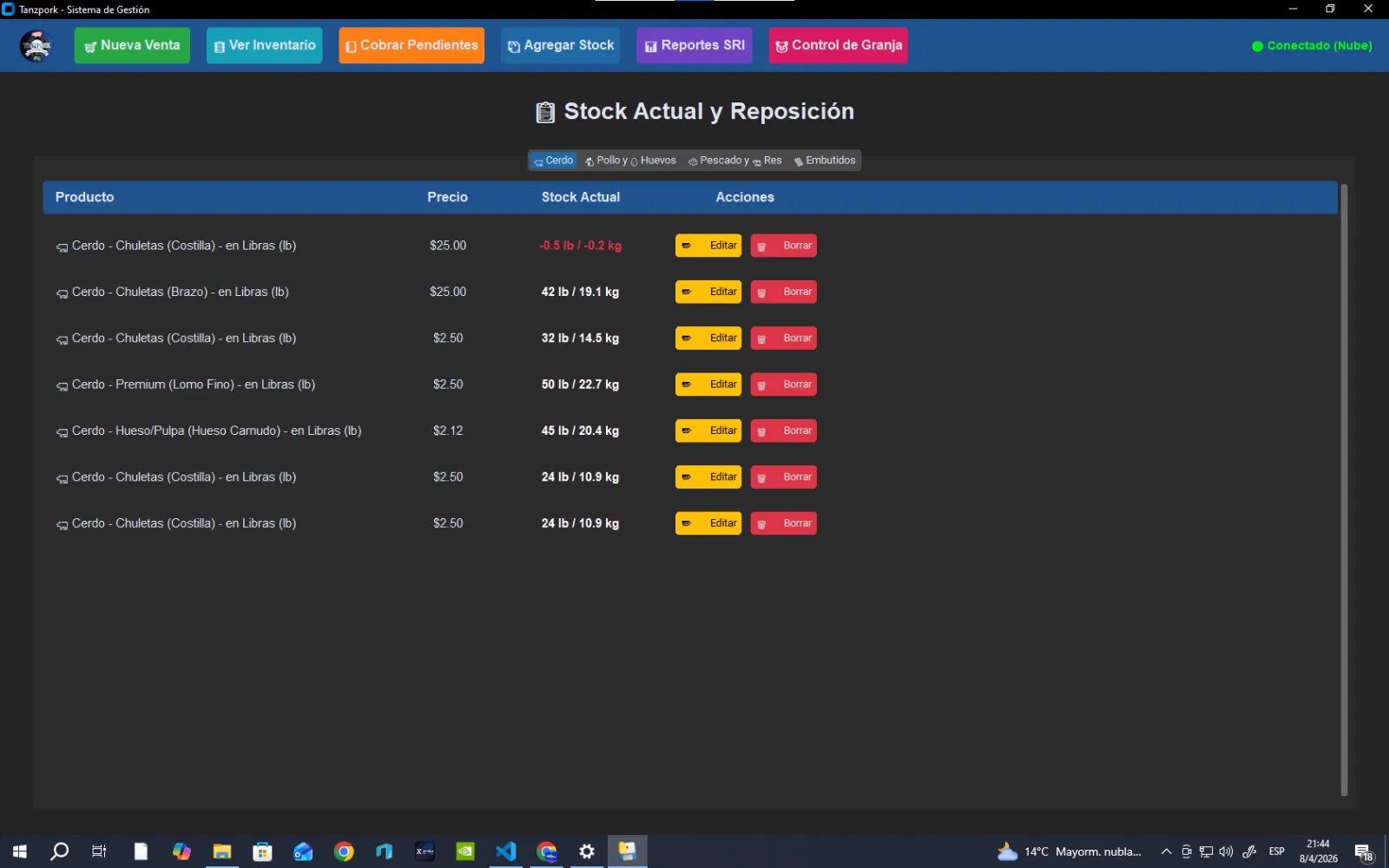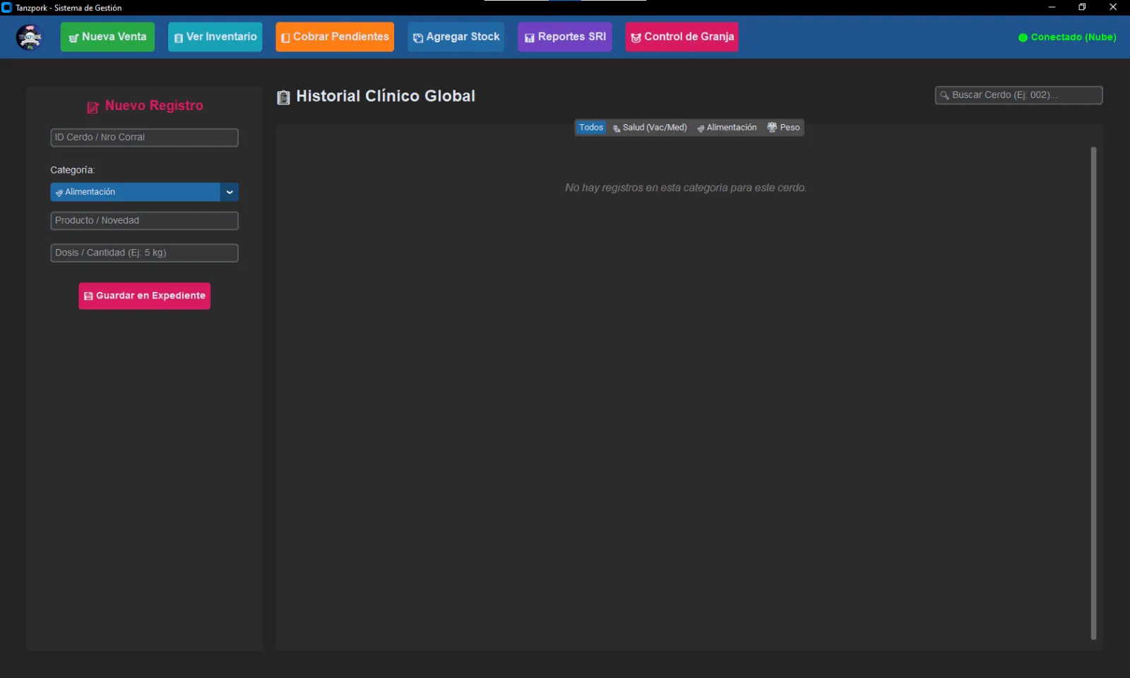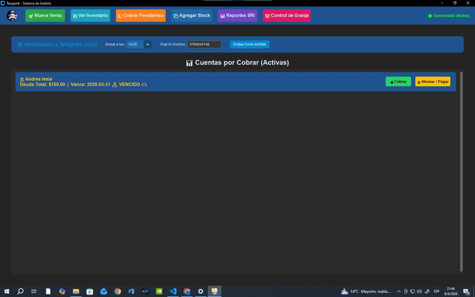 Ver Galería 3D Sistema integral con facturación, inventario, cobros por apartados y notificaciones vía Telegram (alertas de vencimiento). Incorpora base de datos híbrida (Local + Supabase) con radar de red y sincronización offline autónoma. Además, incluye un avanzado módulo de control de granja para el registro de salud, alimentación y peso de los animales.
